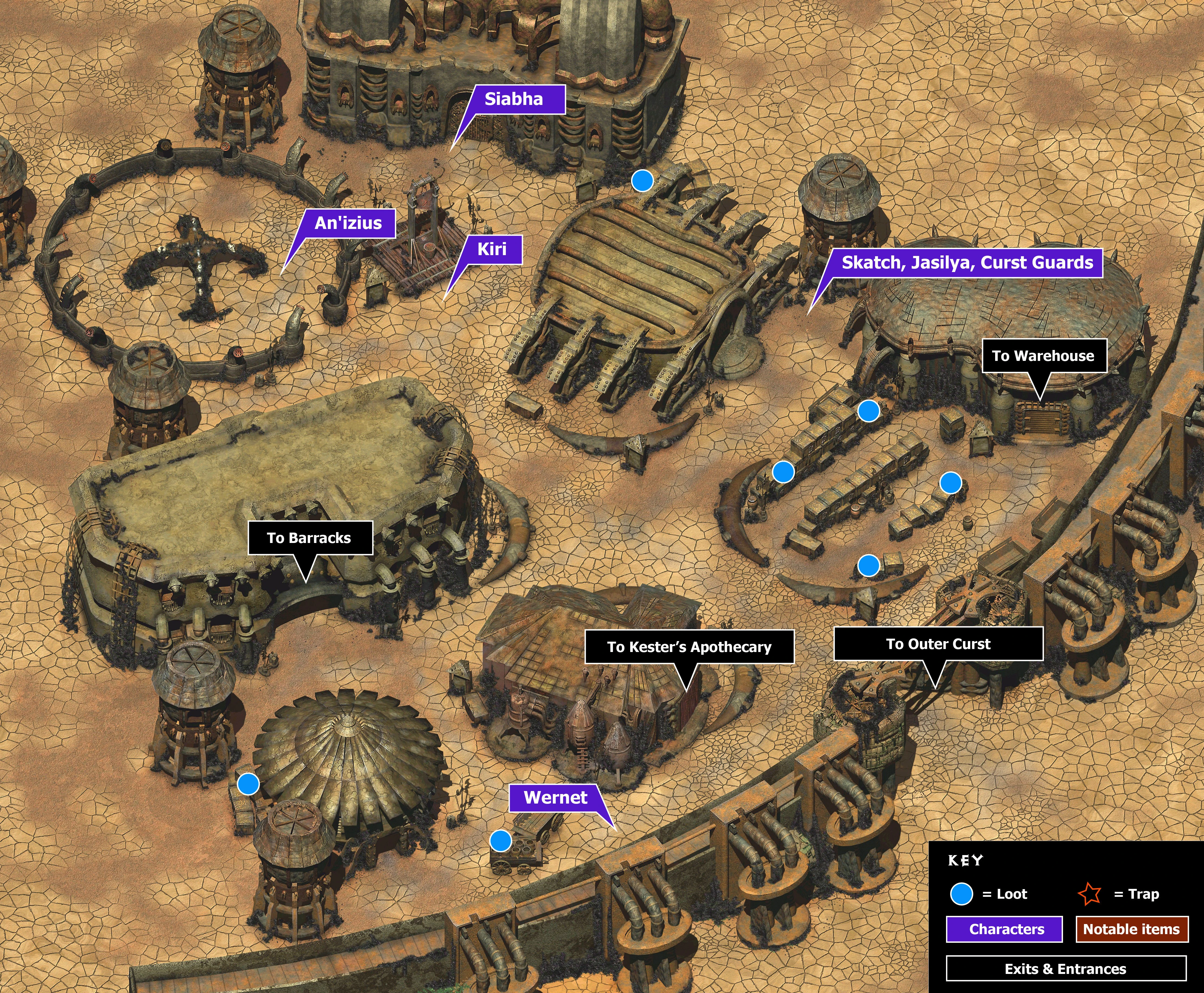 - An'izius, Githyanki 775, 740 (11 on the map). Back and forth between An'izius and Siabha then to Captain of the Guard, then return to Dallan in the Traitor's Gate Tavern. If fingering An'izius or both, do not go back to Curst Underground from Curst Prison, as this activates a bug later in the fallen version of Curst. Should the player decide to report either or both of them to the Guards, they will later be in Curst Prison, and as with Roberta, are vengeful.