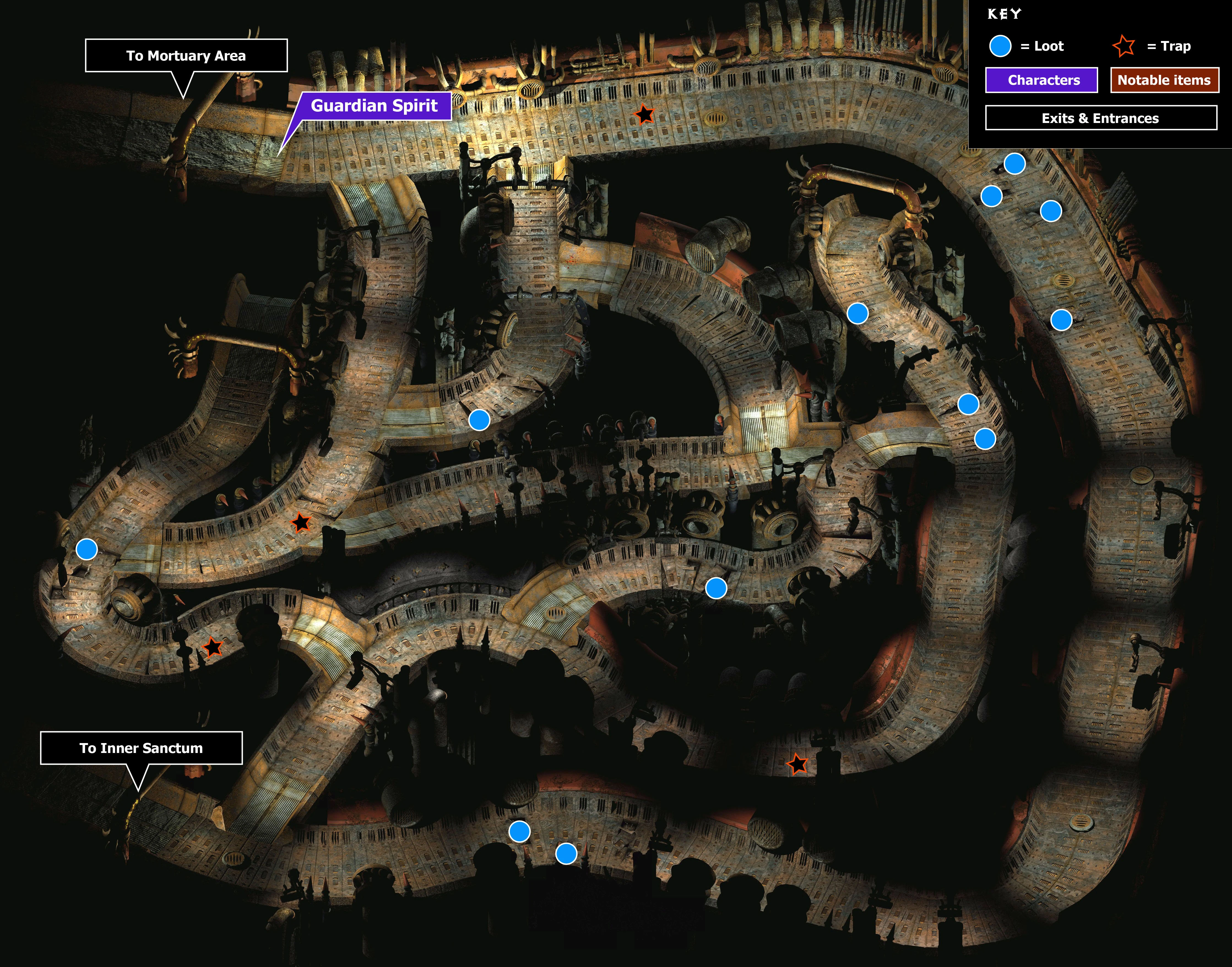 | Mortuary Area (Mortuary | Gathering Dust Bar | Mausoleum) • Northwestern Area • Marketplace Area • Smoldering Corpse Area (Smoldering Corpse Bar | Fell's Tattoo Parlor) • Alley of Dangerous Angles • Ragpicker's Square | |